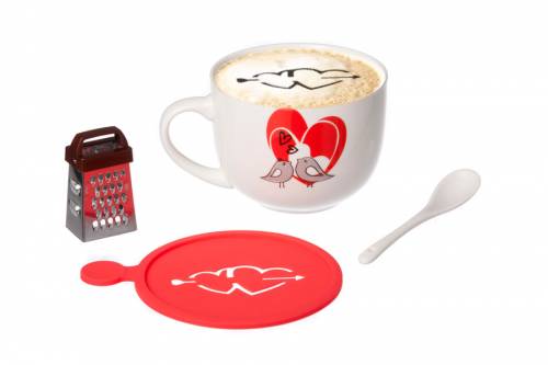 Ведь чтобы выпить вкусный и красиво оформленный кофе, не обязательно ходить в кофейню и платить лишние деньги. В этом поможет набор, состоящий из романтичной кружки, удобной ложки, минитерки для шоколада и трафарета для украшения кофе. Материал чашки- фарфор.